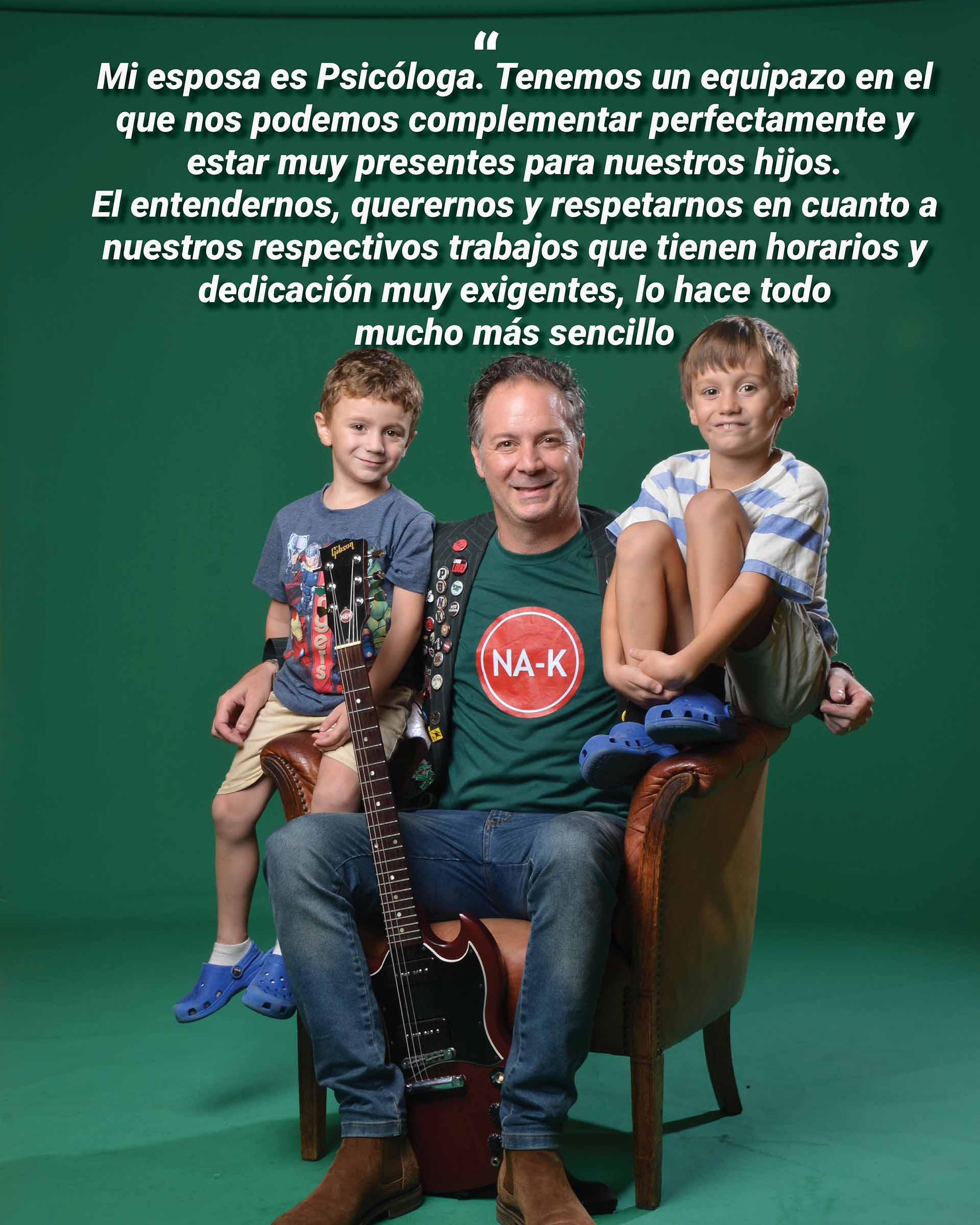 Tengo la suerte bendita de que mi esposa me conoció con la guitarra a cuestas, sabe cuál es mi pasión, conoce mi formación, mi educación, mis valores, mis principios, y ella también es muy apasionada, súper profesional y dedicada en su trabajo entonces juntos nos acompañamos y nos ayudamos y complementamos en todo. Y mis suegros (Silvia y Julio) y mis viejos (Inés y Nicolás) son también súper colaboradores con los chicos y nos ayudan muchísimo.